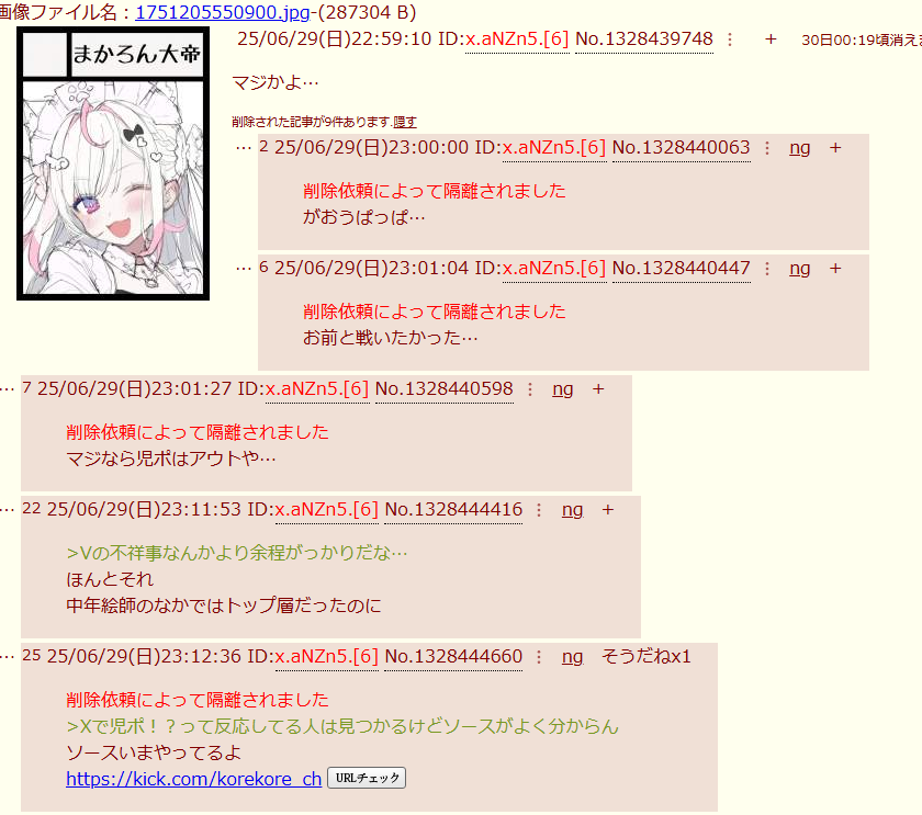| … | 55625/06/30(月)00:19:03No.1328466354そうだねx2>コレコレ「有名vtuberに俺の元セフレがいる」 |