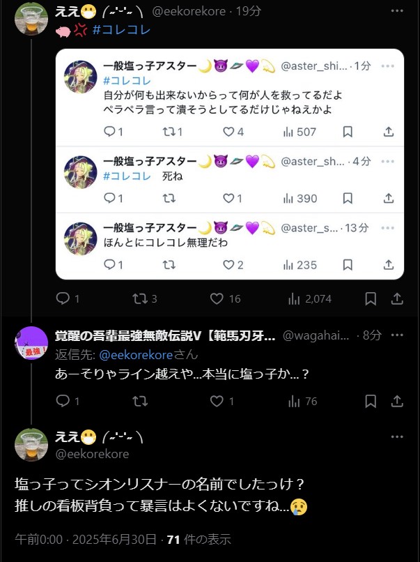 | … | 53025/06/30(月)00:12:55No.1328464380+>推しの名前背負って暴言ってにじさんじリスナーの日常的行為じゃん |