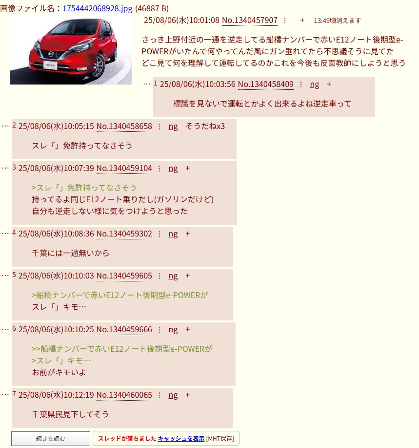 さっきふたばちゃんねる付近のimgで糞スレ立ててるE12ノート乗り(ガソリンだけど)がいたんで何やってんだ風にレスしてたら不思議そうにキレてたこのスレは古いので、もうすぐ消えます。