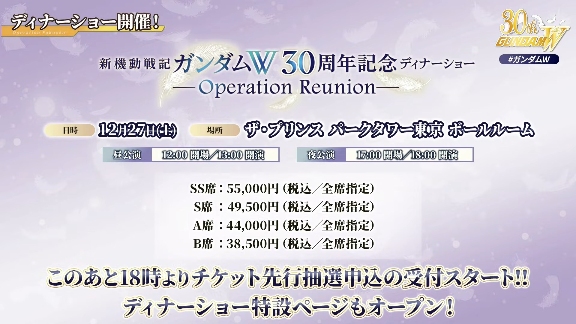 | … | 5325/08/09(土)20:05:54No.1341498015+>ガンダムW30周年ディナーショーがあるの |