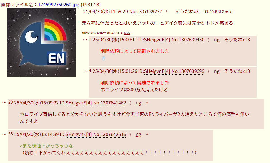 | … | 4425/08/10(日)16:28:29No.1341781303+Vtuberに粘着してるの? |