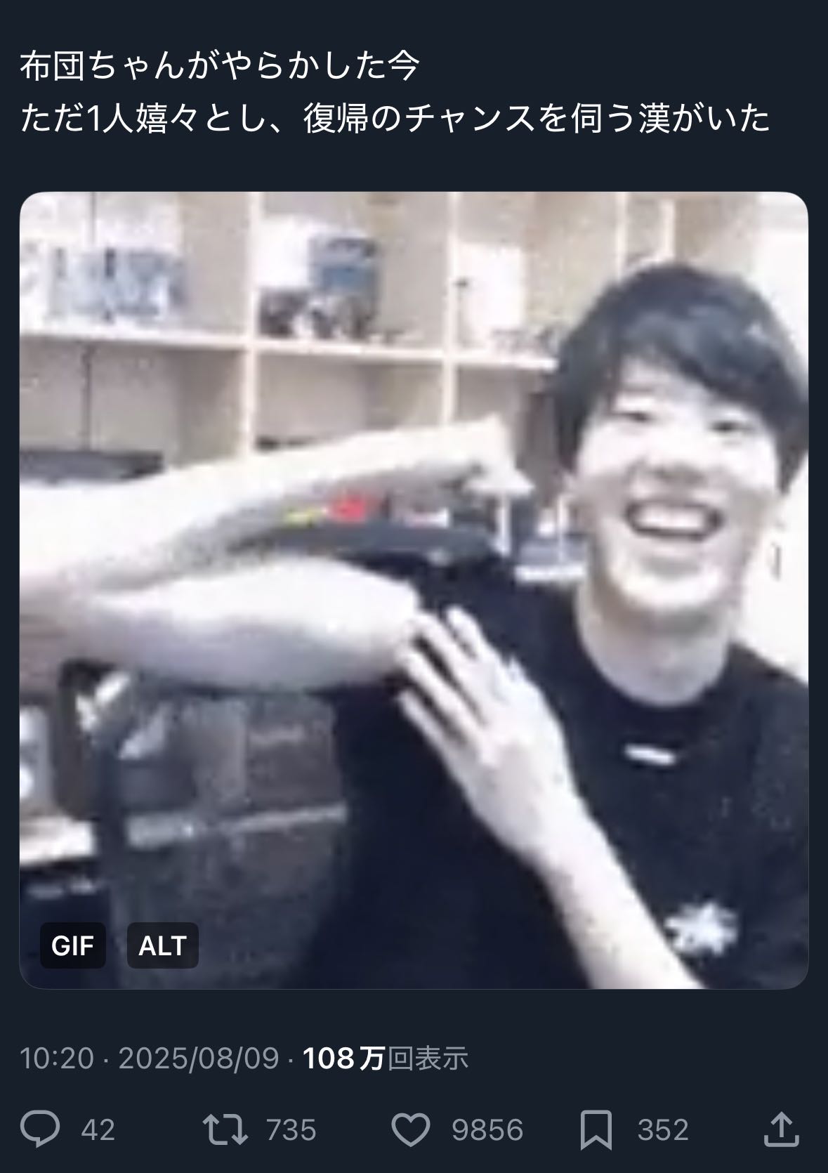 | … | 2025/08/11(月)19:19:00No.1342161819+布団を葬送してリアニメイトしてきた男 |