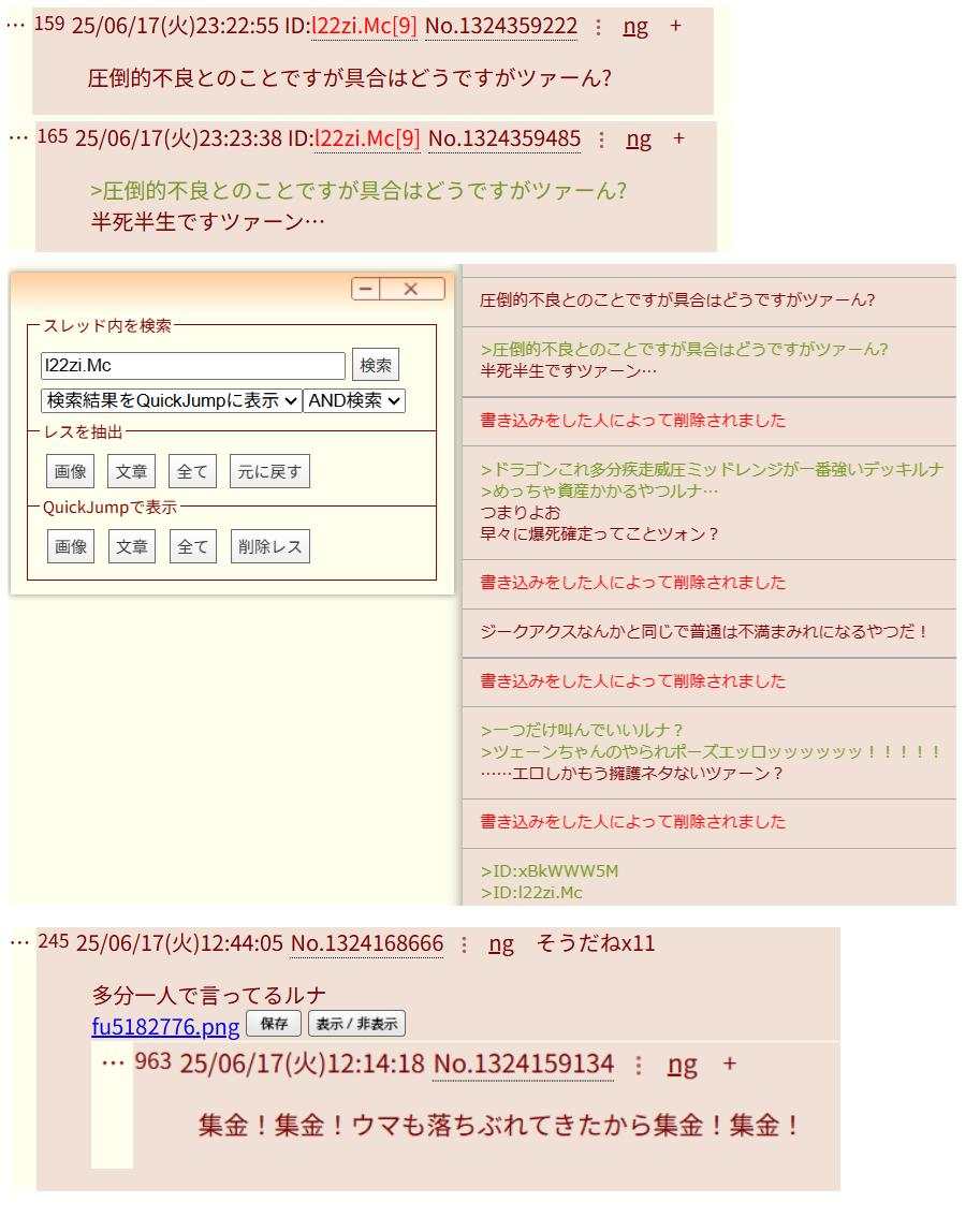 | … | 8125/08/18(月)19:11:02No.1344525732+>たった2枚のプリントスクリーンでジークアクス・ウマ・ワンピ・ヒロアカの粘着も兼任してる情報が入ってる濃度 |