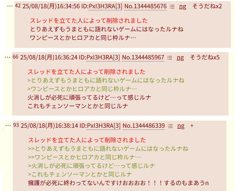 | … | 725/08/18(月)18:15:08No.1344508744+書き込みをした人によって削除されました |