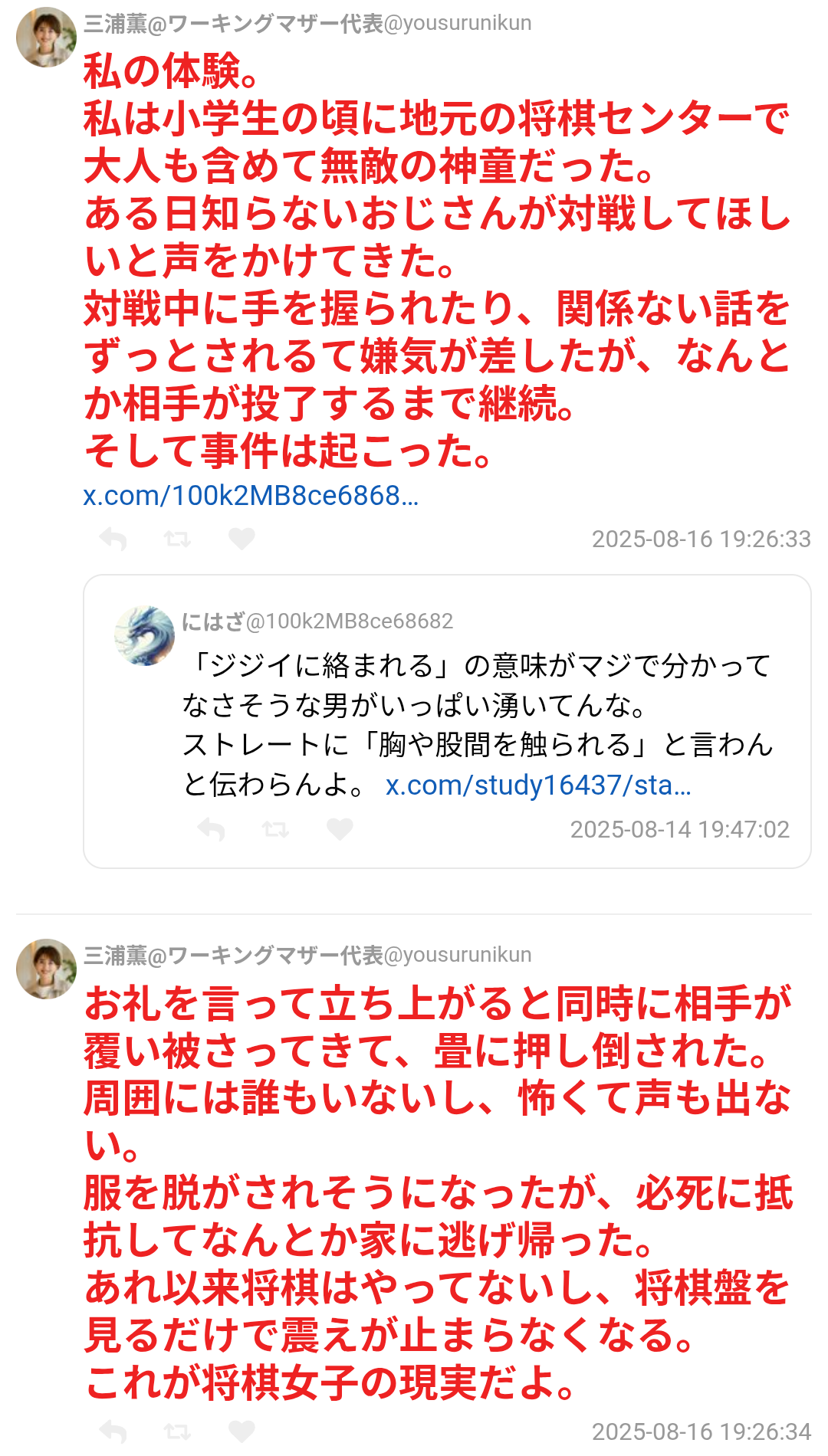 | … | 10925/08/18(月)20:03:18No.1344543874+>女児が将棋始めるとレイプされるとかいう最悪のネガキャンが促進派から発生するのちょっと酷すぎる |