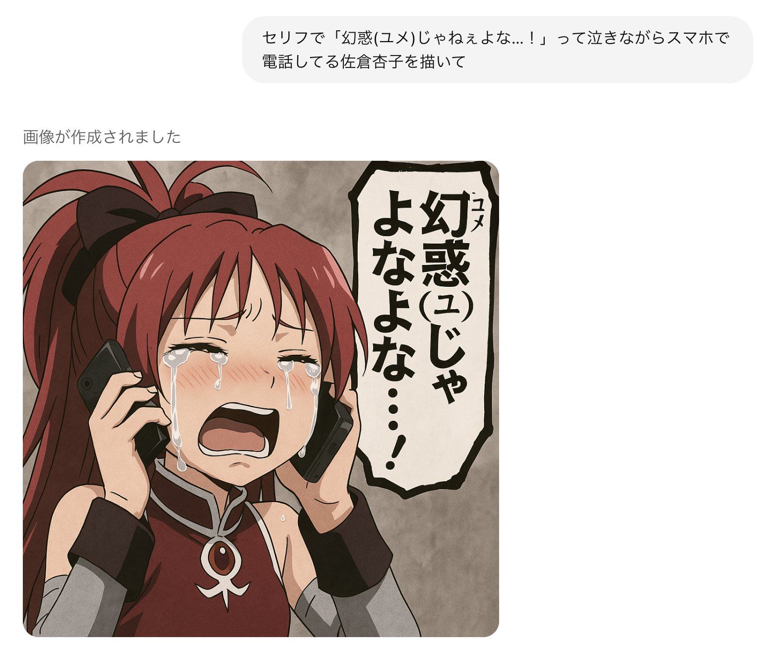 | … | 4825/08/28(木)09:08:34No.1347601398+こんな号泣するって事は叛逆の前の時間軸で円環に還ったさやかから電話来たって状況かな |