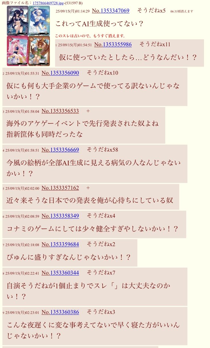 | … | 9125/09/18(木)21:26:29No.1354509284+担当絵師の独断でAI生成使ったとして |