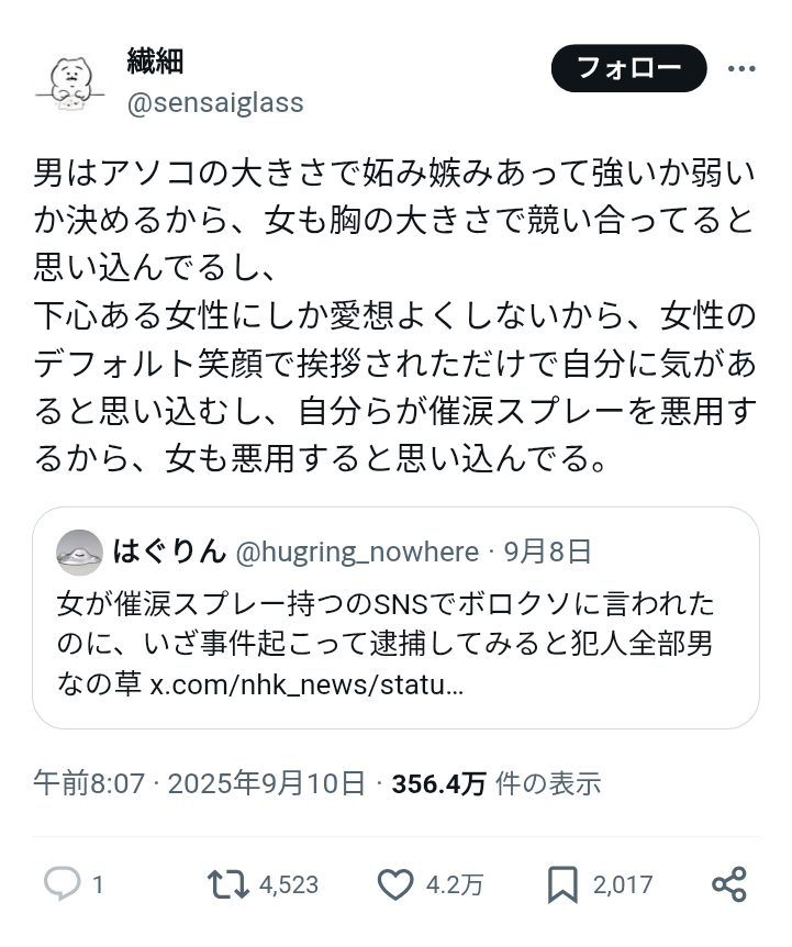 | … | 6225/09/21(日)03:10:05No.1355252773そうだねx1まさに女は些細なことで妬んで強弱を決め合うから男もそうだと思い込んでいる例だ |