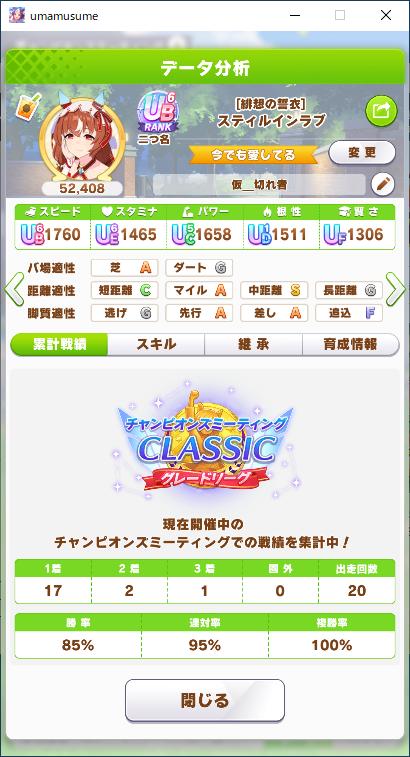 | … | 9525/09/22(月)19:24:45 ID:QssSin3INo.1355755052+>姫勝ててないの意外ですね 確認したらタクトちゃんとタマのサポカ完走してないのが響いてますね そしてそれ以上に後方多すぎて早めに上がりすぎたのもありました |
