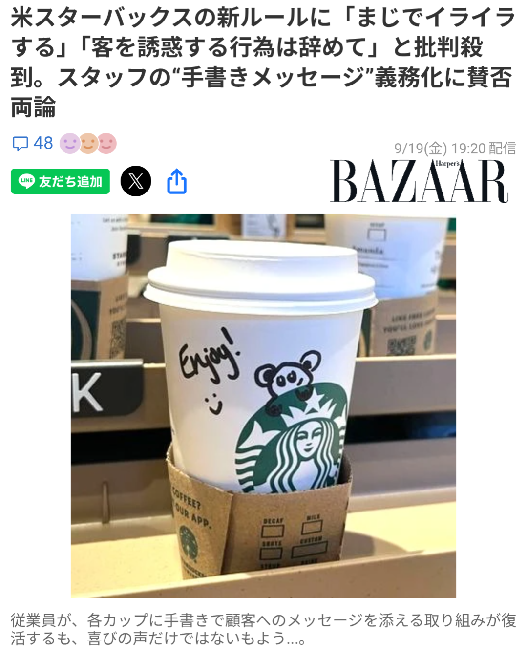 | … | 2825/09/23(火)16:54:46No.1356040809そうだねx10>「全部のカップにただ『素晴らしい1日を!』と急いで殴り書きすることに、本当に意味があるのでしょうか?そんなこと、私はやりたくありません。それで本当に、顧客と繋がっているといえるのでしょうか?」 |