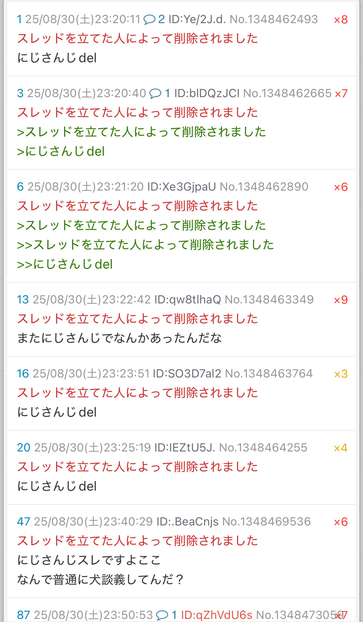 | … | 3325/09/30(火)00:09:50No.1358216324そうだねx4del入れられまくって閾値下がってんのにルーパチもせずに自演とかアホか |