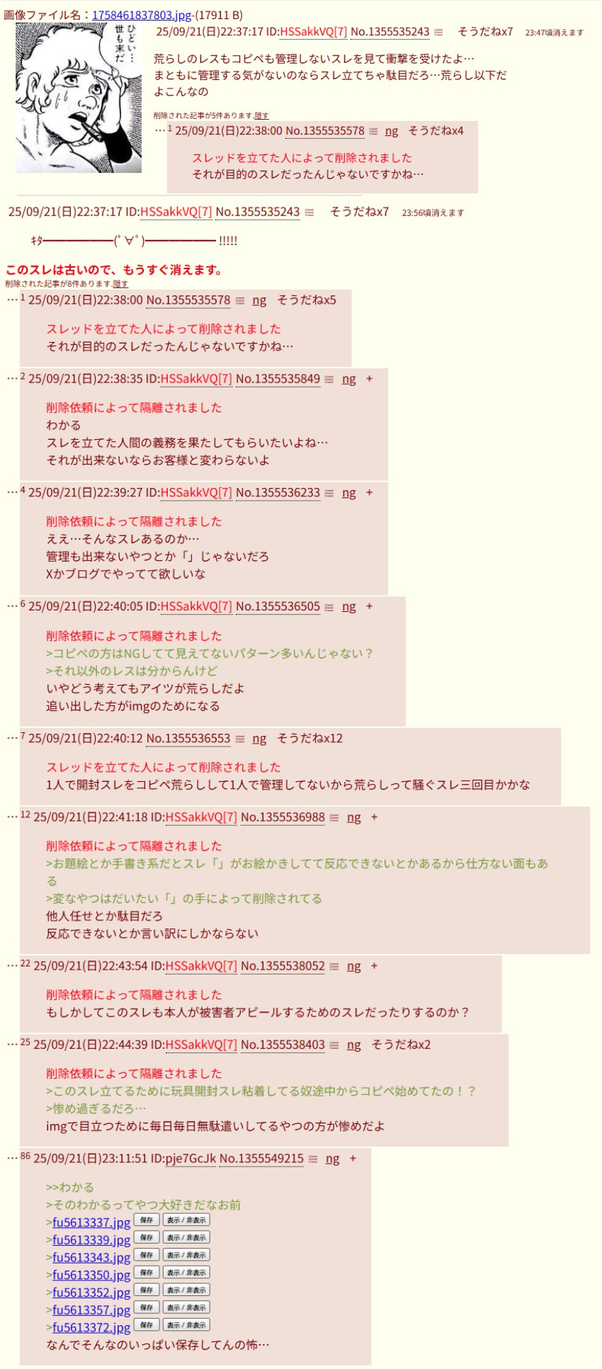 | … | 925/09/30(火)19:33:36No.1358423865+スレッドを立てた人によって削除されました |