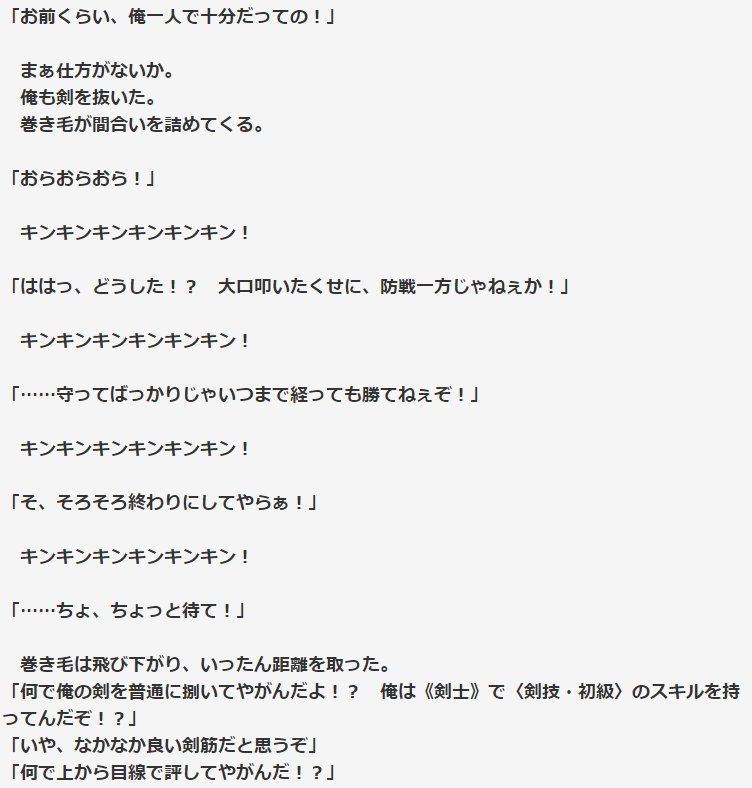 | … | 5325/10/06(月)01:39:43No.1360131176そうだねx5実際ここはギャグ描写に近い感じで剣士が無職相手に打ち合って何で打ち合えてるの!?ってなってるシーンなのでキンキンキンキンが1番適切では?って思う |