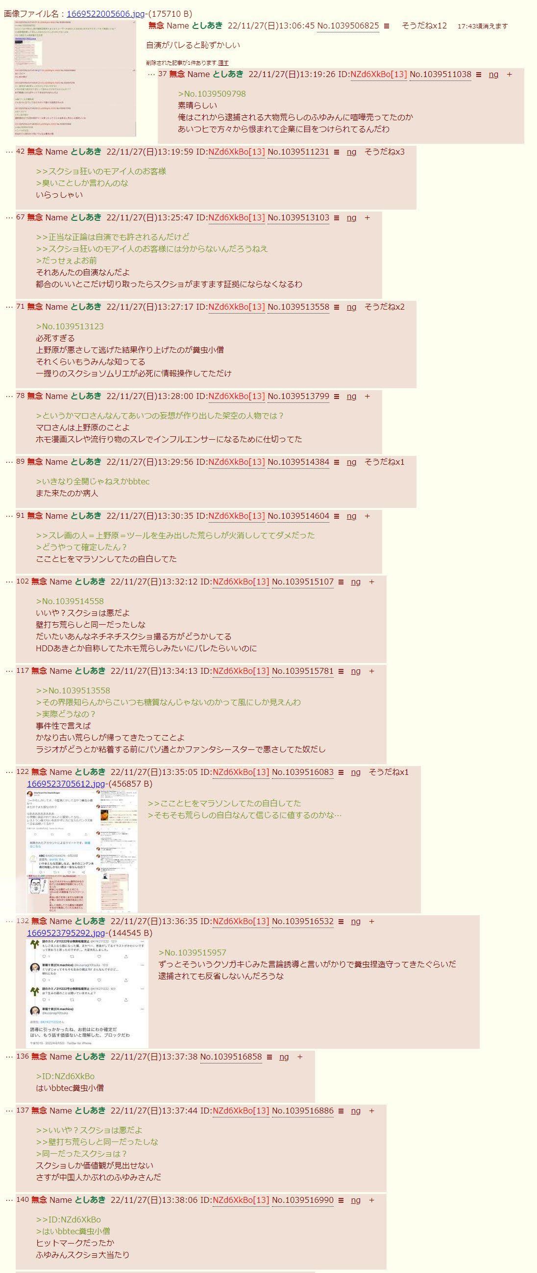 | … | 74825/10/12(日)12:49:11No.1362052208そうだねx1>>言動や知能レベルや使う造語は客観的な証拠だろ |