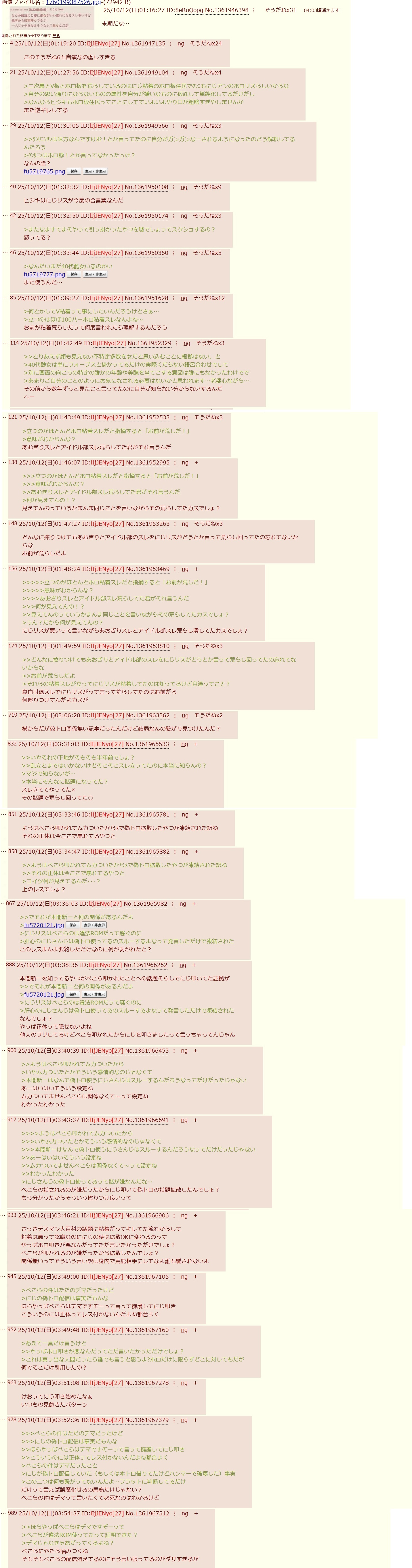 | … | 1525/10/12(日)15:38:13No.1362097761+オラヒジキ!いつもみたいににじリスがどうたらレスしてみろや! |