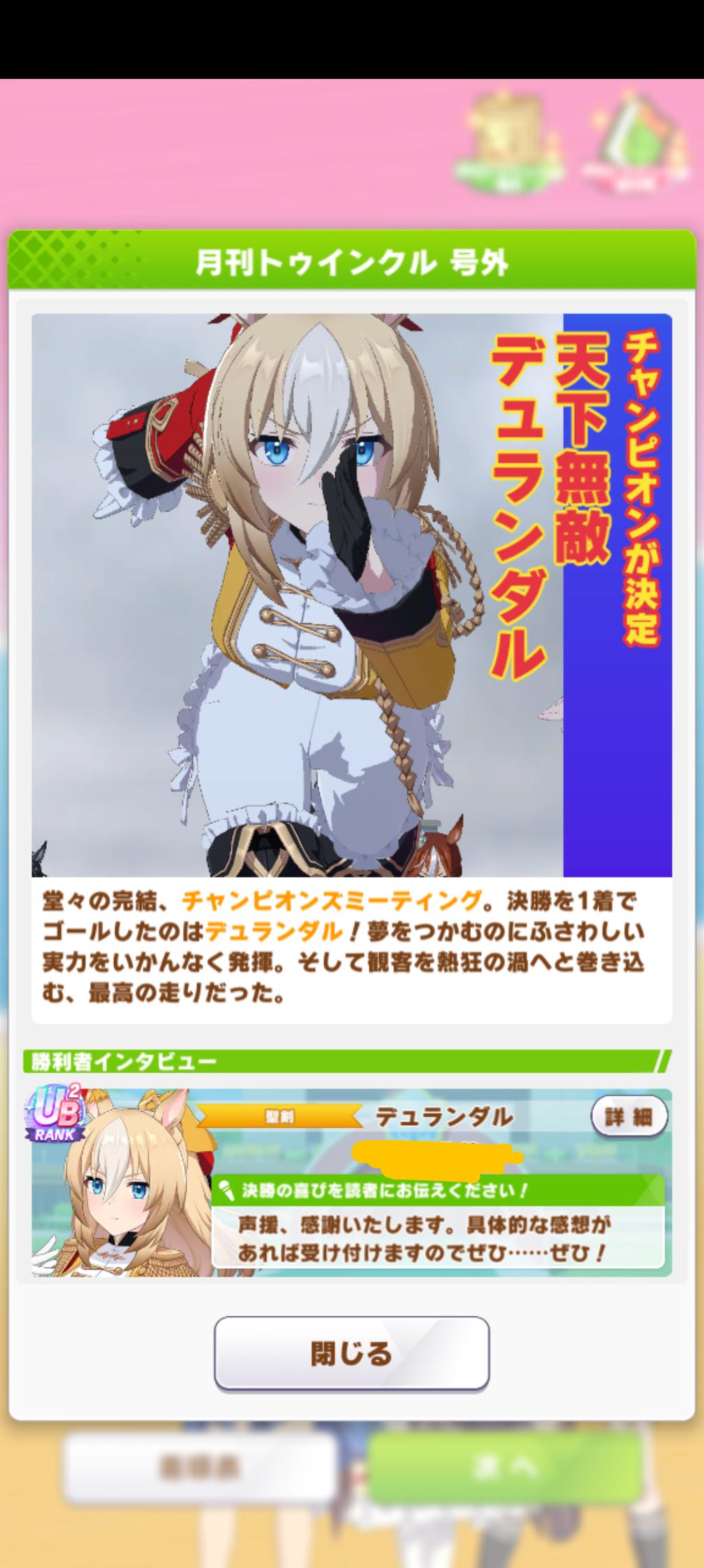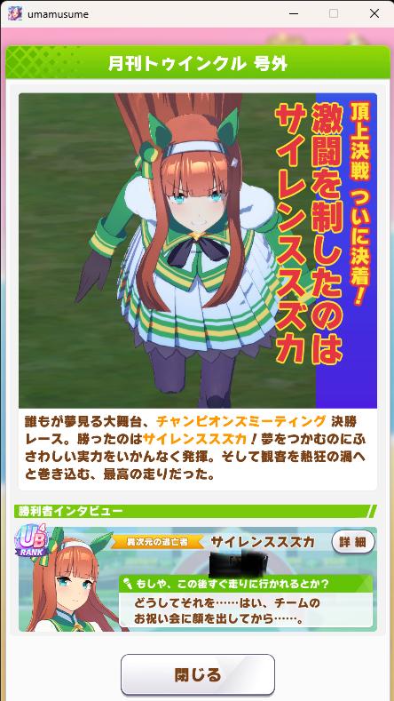 | … | 26225/10/28(火)14:47:10No.1367135124+凱旋門やりたいウインディちゃんが多いあたりやっぱ何だかんだで好きな子出したいのだな |