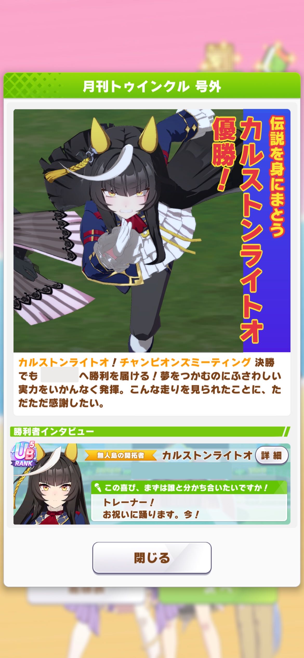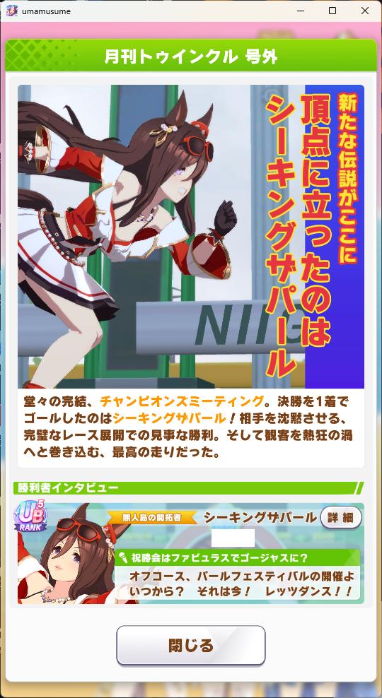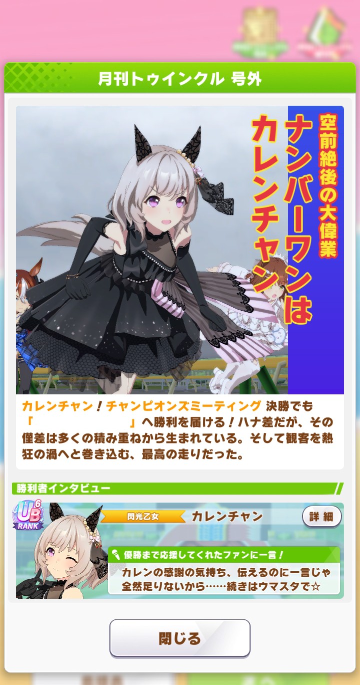 | … | 8725/10/28(火)18:39:32 ID:.ki7xmVYNo.1367191518+今回は多分シナリオ衣装でしょうし新キャラや新ウマ娘の発表がなさそうなぱかライブは平穏な気持ちで見られます |