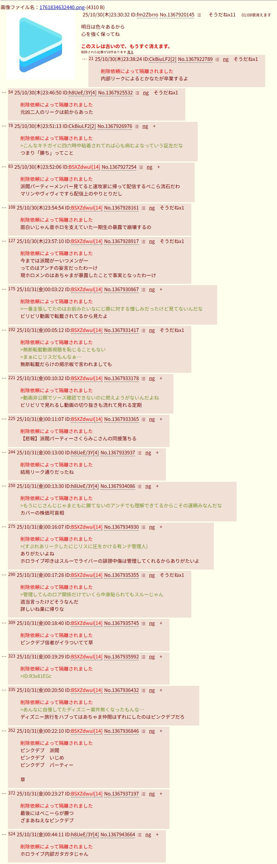 | … | 4525/10/30(木)23:44:11No.1367924685そうだねx19>>内部リークによるとかなたが卒業するよ |