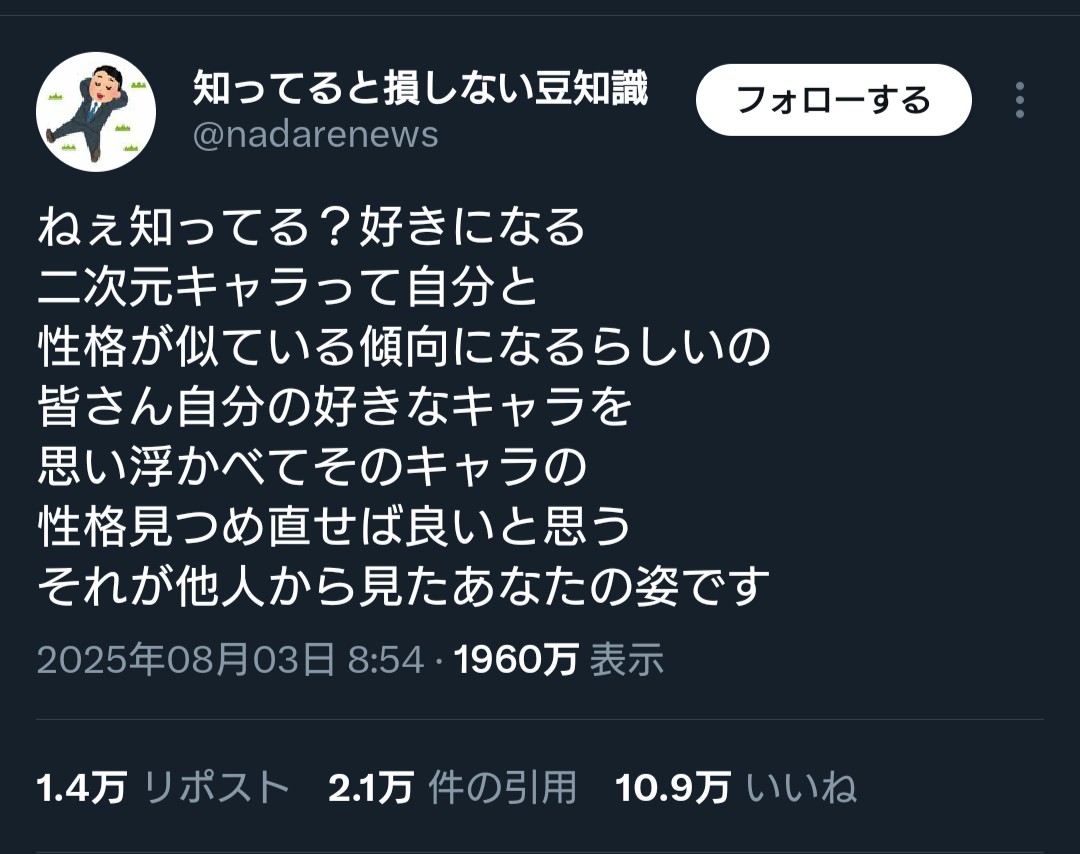 | … | 2525/10/31(金)11:42:20No.1368015838そうだねx14言われてみれば俺〇〇(アニメの人気キャラ)と似てるところあるわ〜を大量に引き出す為だけのあくらつな発言 |