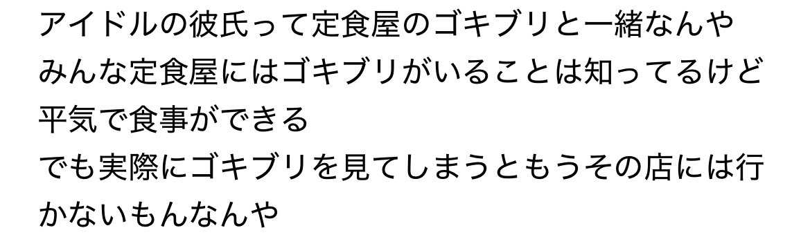 | … | 12725/11/05(水)10:39:24No.1369651343そうだねx3>こういうので「相手が彼氏がいようが応援するのがファンだろ!」みたいなこと言う人居るけどアイドル側に都合が良すぎる話だよな…って思ってる |