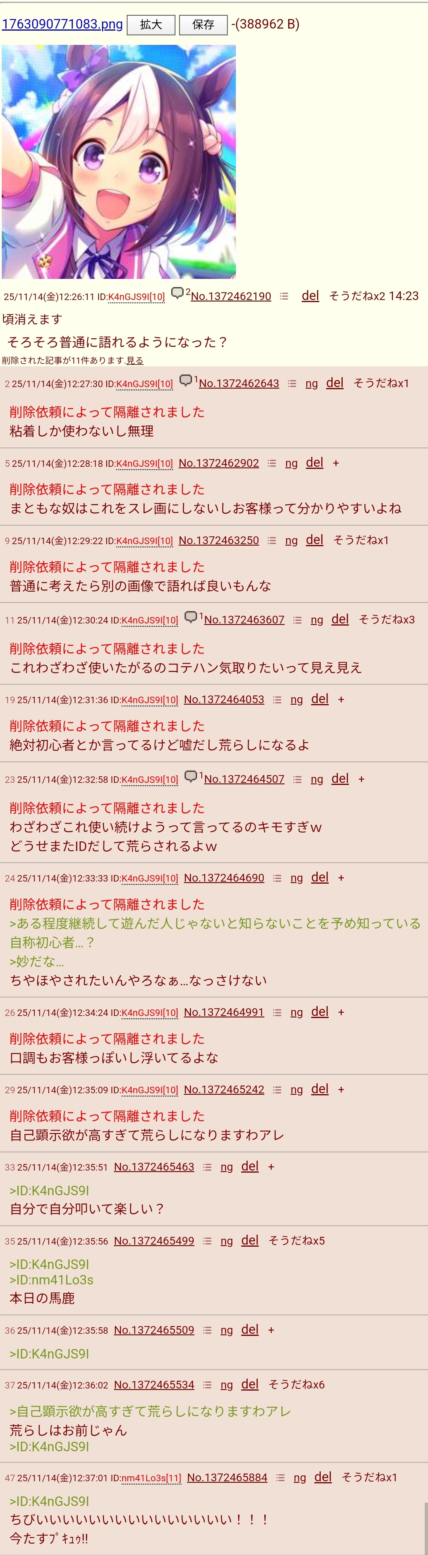| … | 1125/11/14(金)15:47:43No.1372508620そうだねx17最近スレ画つかったスレでも荒れることなく盛り上がってたから発狂してんのかこのカス |