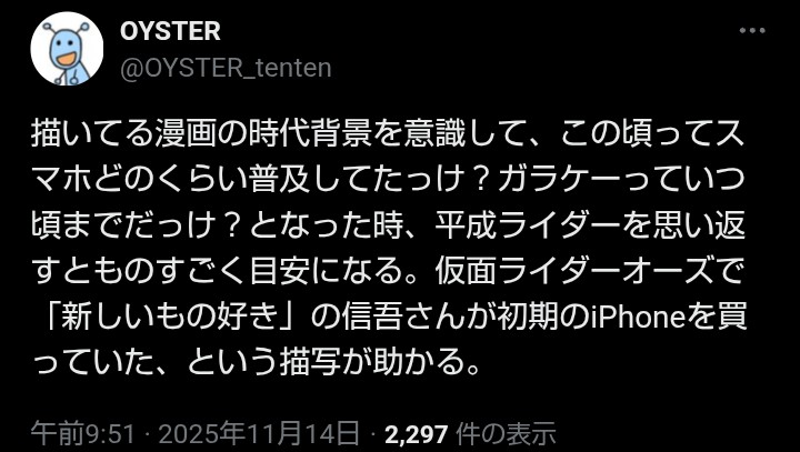 | … | 3025/11/14(金)18:16:20No.1372542627+平成ライダー並みに続いてる長寿番組だと科捜研の女とか相棒とかも時代背景の目安に使えそう |
