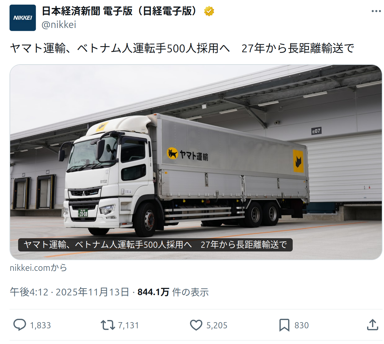 | … | 22025/11/15(土)00:31:42No.1372687700+スレ画の件に関してはベトナム人がどうこう以前に長距離ドライバー一気に500人増やすなんてことが可能なのかどうかの方がよっぽどだよ |
