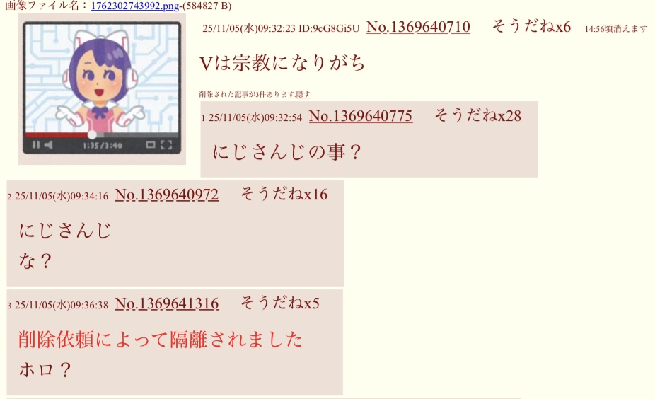 | … | 4025/11/15(土)23:58:06No.1373006493そうだねx3>にじさんじは呆れられることは多いけど叩かれるまでいくことは流石に毎日はないよ |