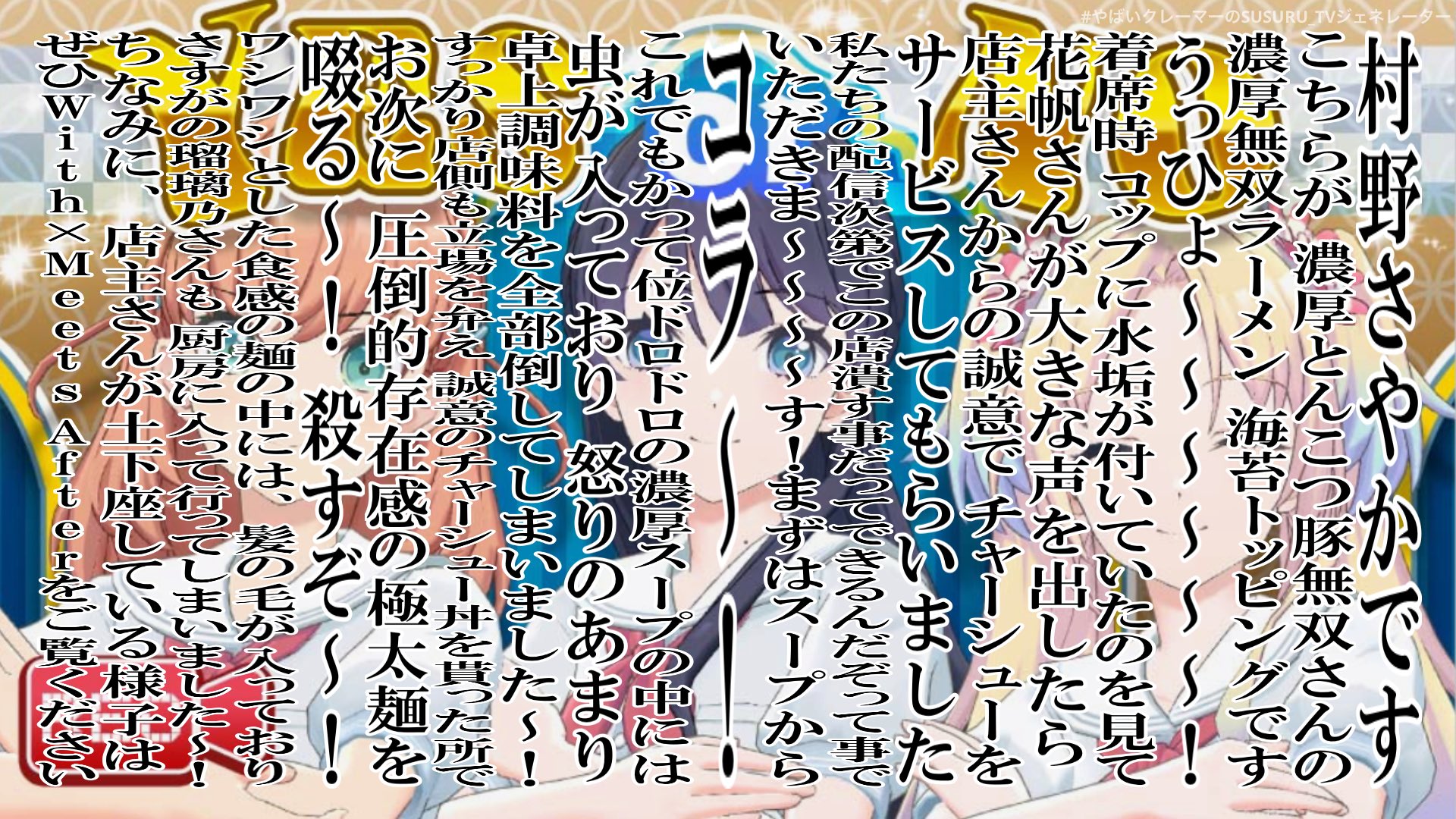 | … | 8025/11/23(日)21:24:14No.1375543908そうだねx4>皆さんこんにちは、村長のお料理チャンネルです。 >今日は唐揚げとおでんを作っていきたいと思います。 ??「今日は唐揚げとおでんを食べました。おいしかったです。」 |