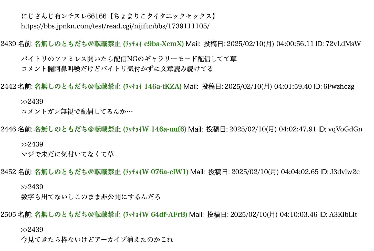 | … | 4025/11/25(火)02:30:33No.1375993147+>だってにじさんじリスナーのせいでここが消し飛ぶ可能性あるし… |