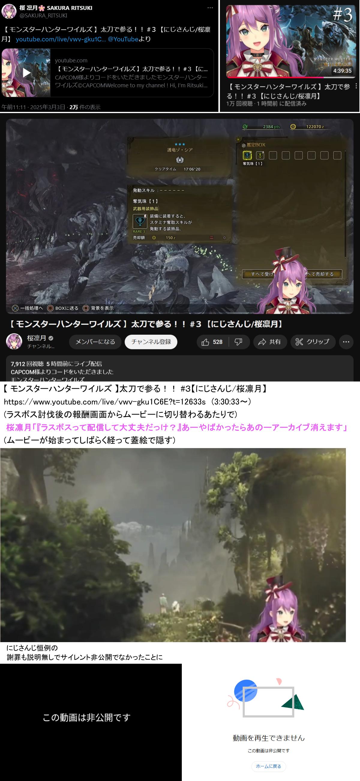 | … | 13825/11/25(火)09:30:17No.1376021219+>モンハンに関しては逆に配信可能な部分なのにコメントでワザップ拾って勝手に映像消して後からコメントにキレてたライバーもいたな |