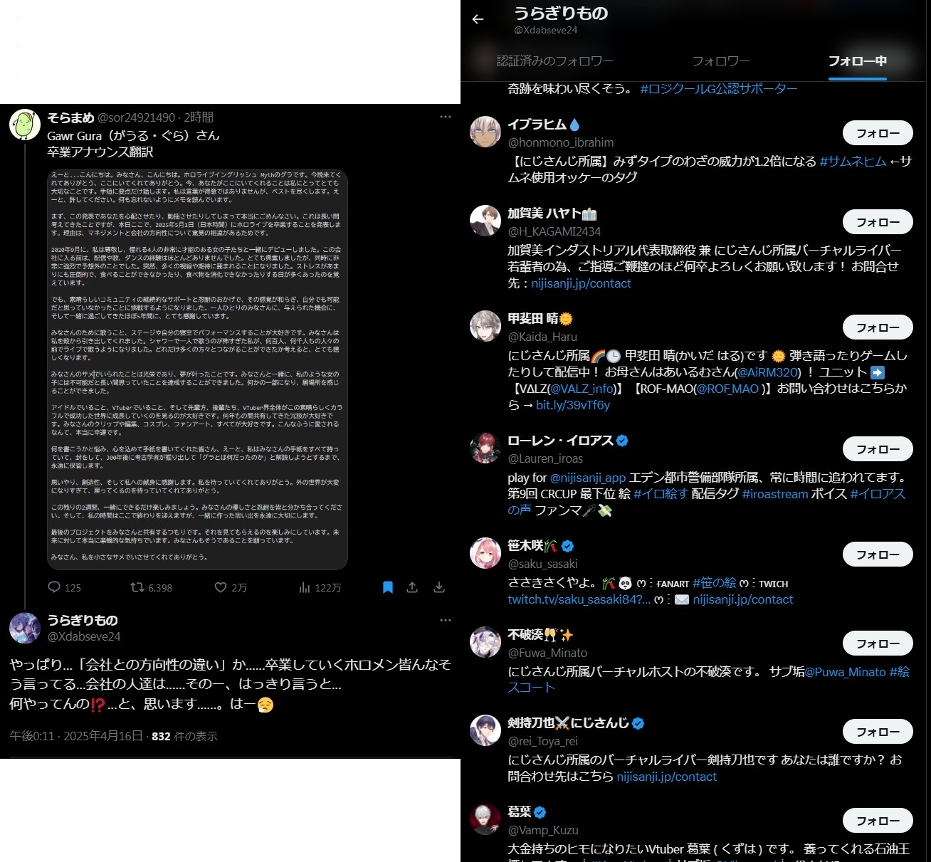 | … | 9625/11/25(火)10:29:21No.1376031223そうだねx6>意味わからんこと言ってるけどお前のその話とこのスレでにじさんじがどうこういうことになんのつながりもないぞ |