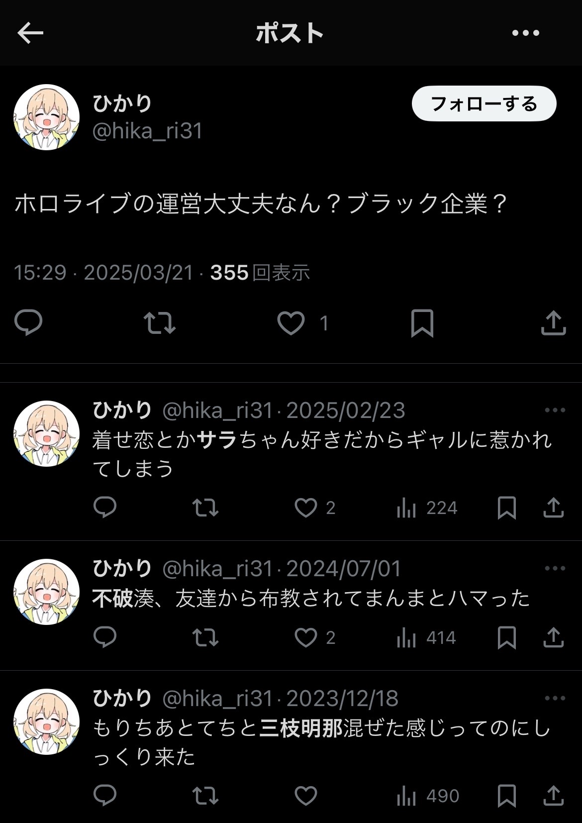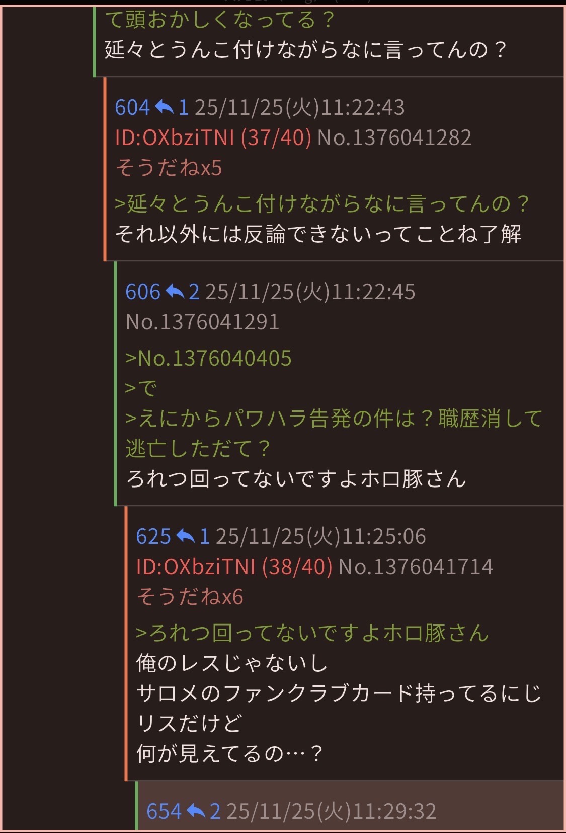 | … | 9725/11/25(火)10:29:25No.1376031230そうだねx1>社内のにじおばが勝手にやったことってバレてるのにまだ続けるんですか? |
