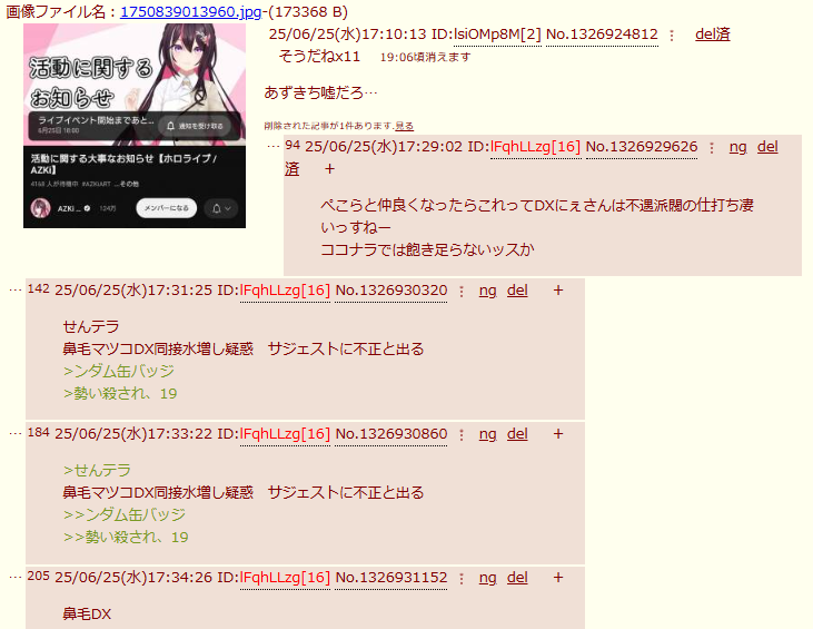 | … | 71625/11/25(火)11:43:42No.1376045318そうだねx6>にじリスさん明確な証拠出せないからイメージで戦い始めたな… |