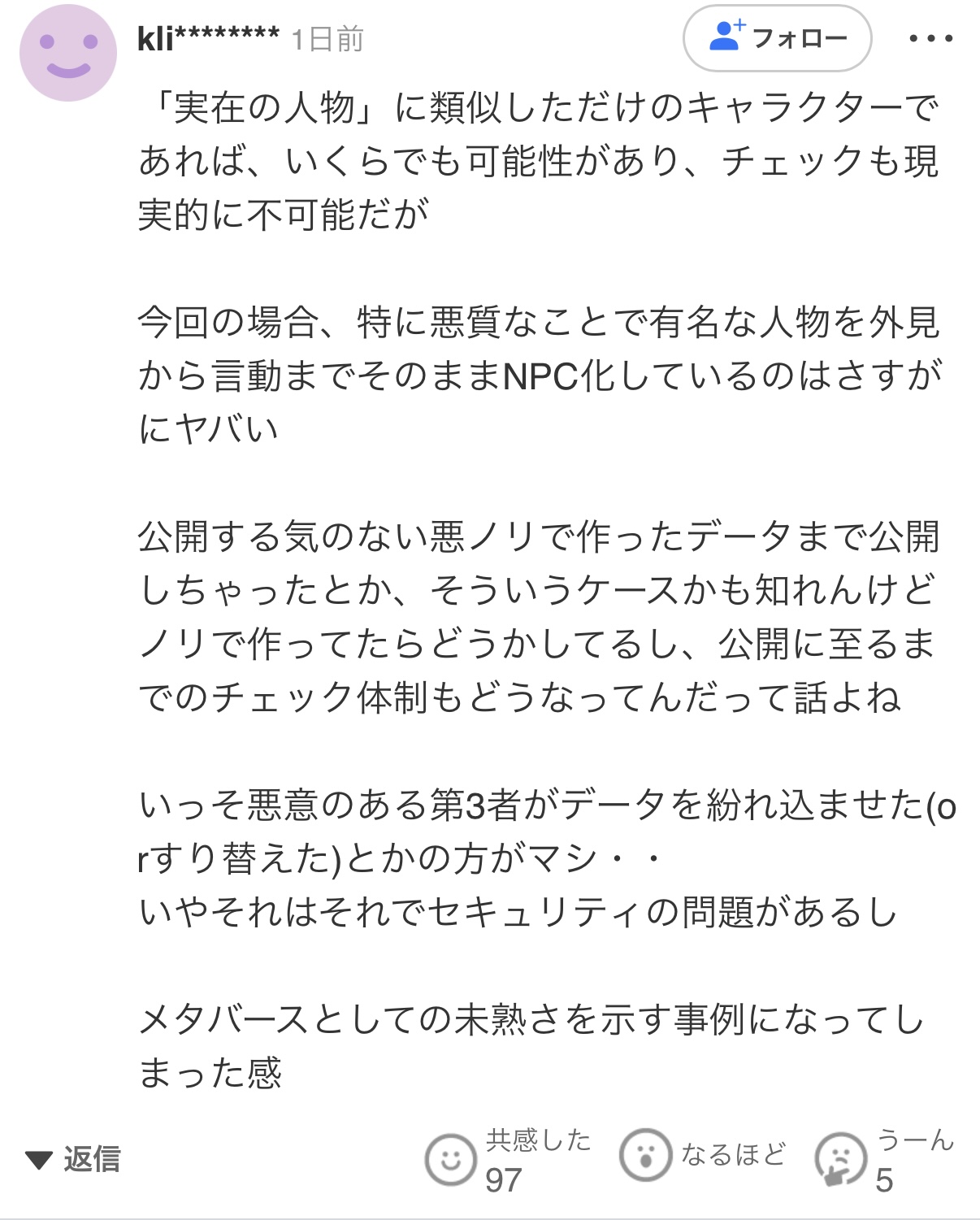 | … | 725/11/27(木)18:04:38No.1376775041そうだねx8これにほぼ共感なのおかしいと思ったが元記事読んだら問題にされてるNPCの画像が無かった |