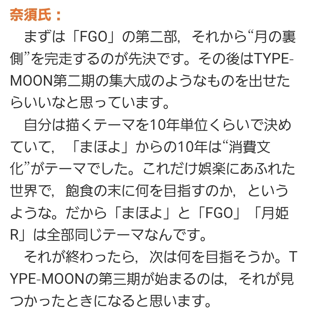 | … | 31925/11/29(土)01:40:57No.1377249382+>>「まずは「FGO」の第二部,それから“月の裏側”を完走するのが先決です。その後はTYPE-MOON第二期の集大成のようなものを出せたらいいなと思っています。」 |