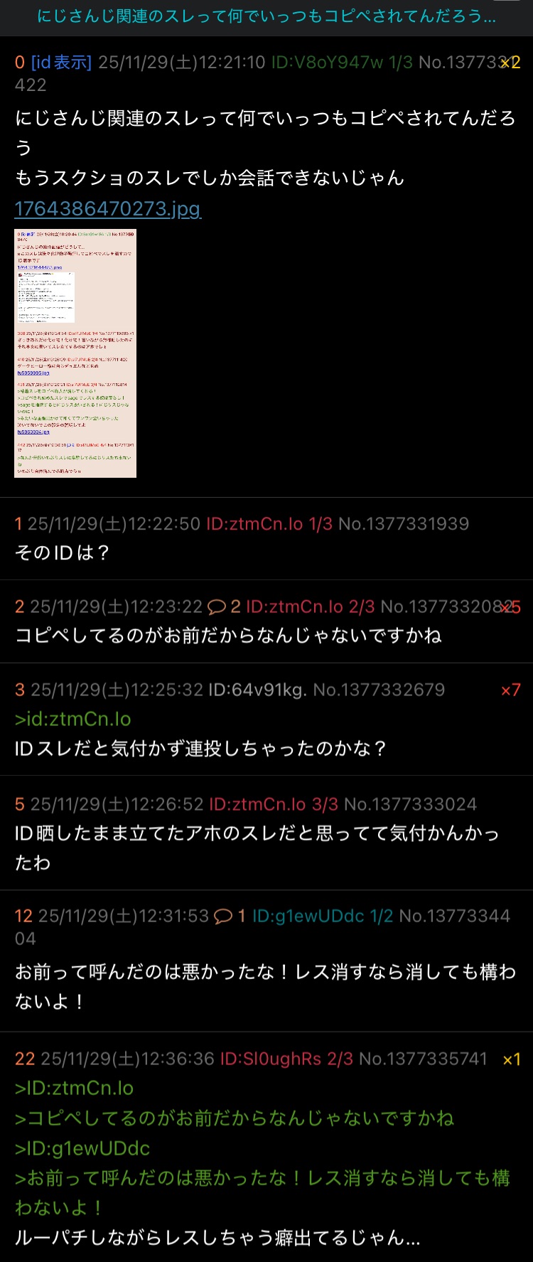 | … | 7925/11/29(土)13:44:39 ID:8l/zneSENo.1377355708+>突然ホロ巻き込もうとしたアホがにじさんじ粘着がさぁ!って喚き出すの病気だろ |