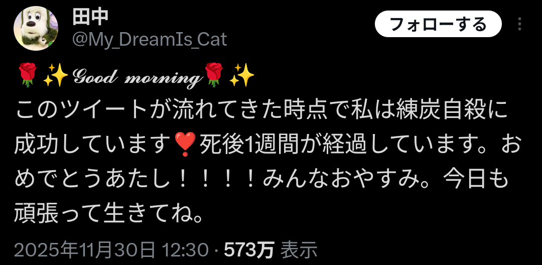 | … | 3025/12/01(月)03:13:32No.1378019223+練炭自殺って具体的にどうやるんだろ |