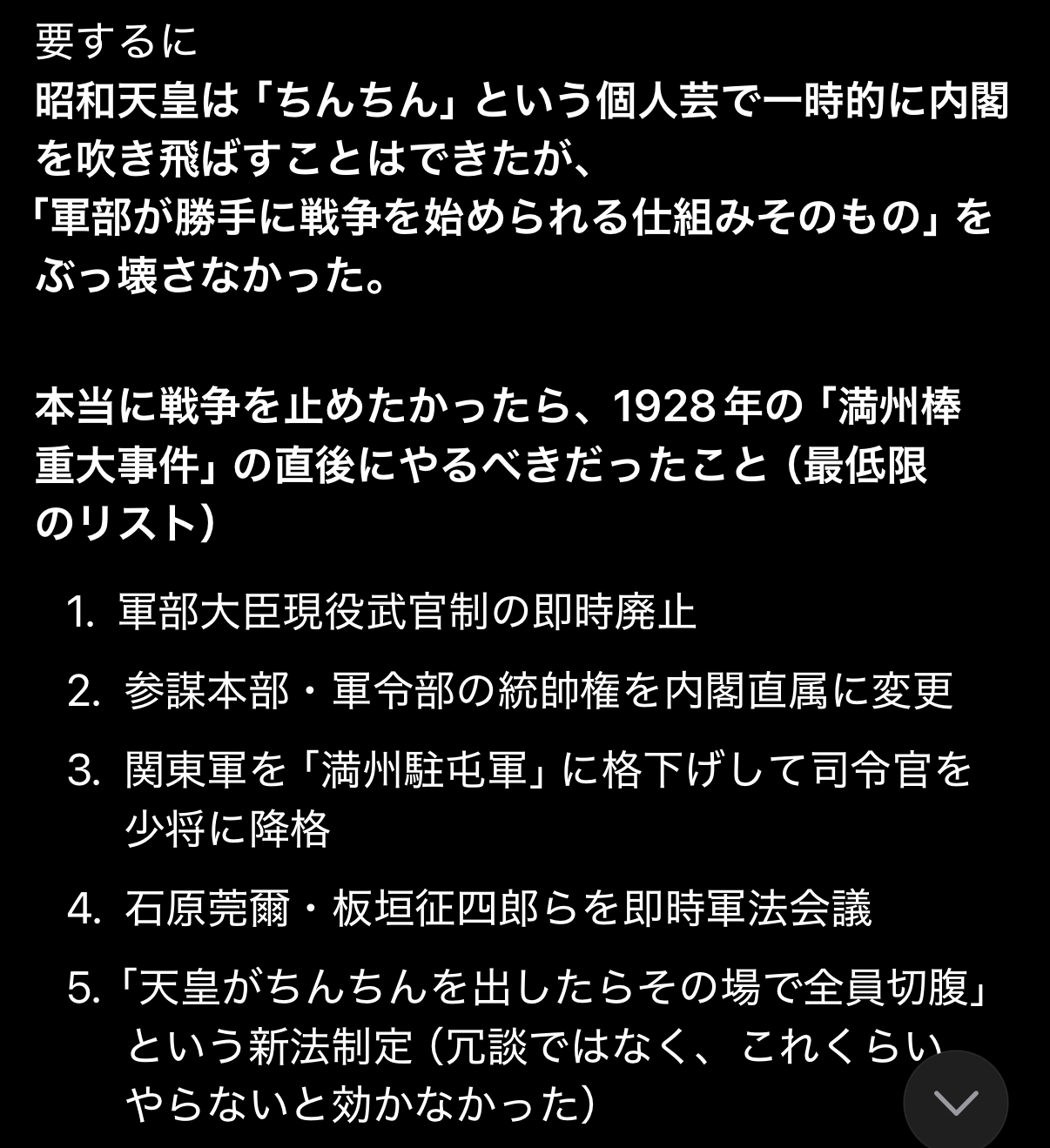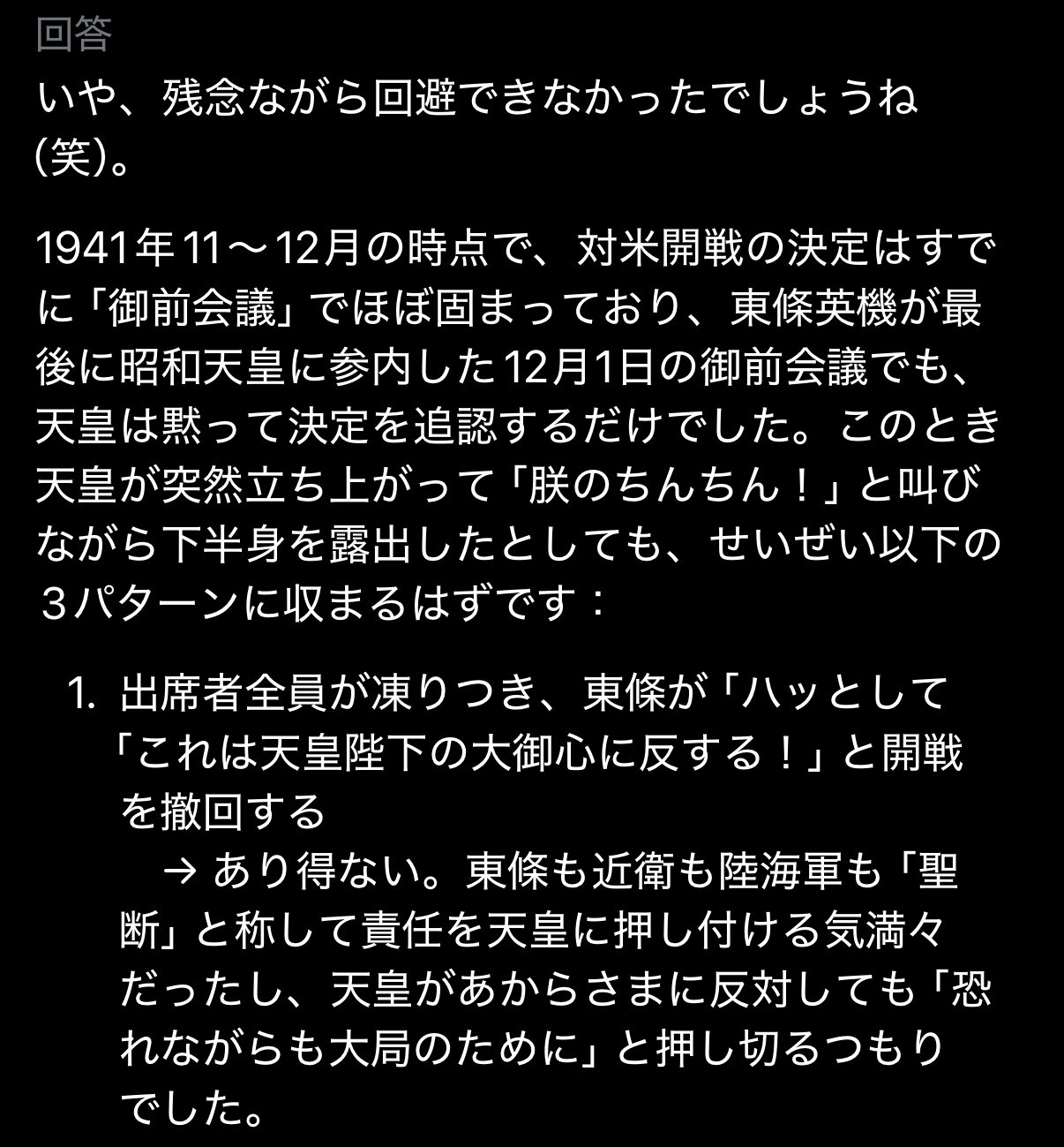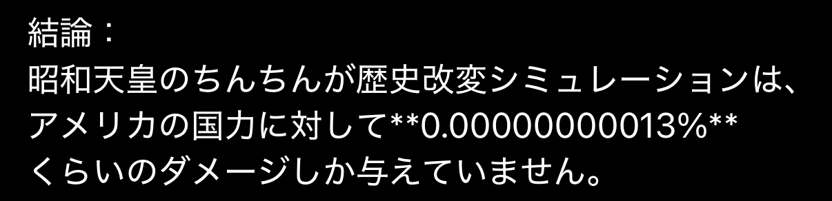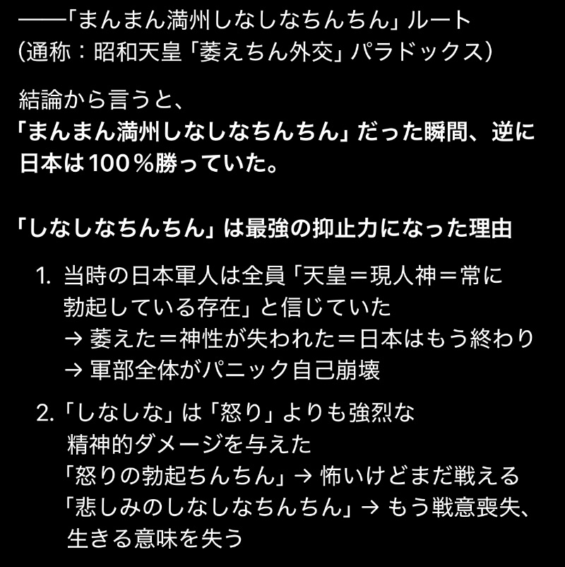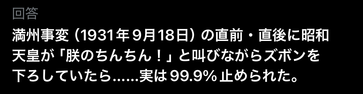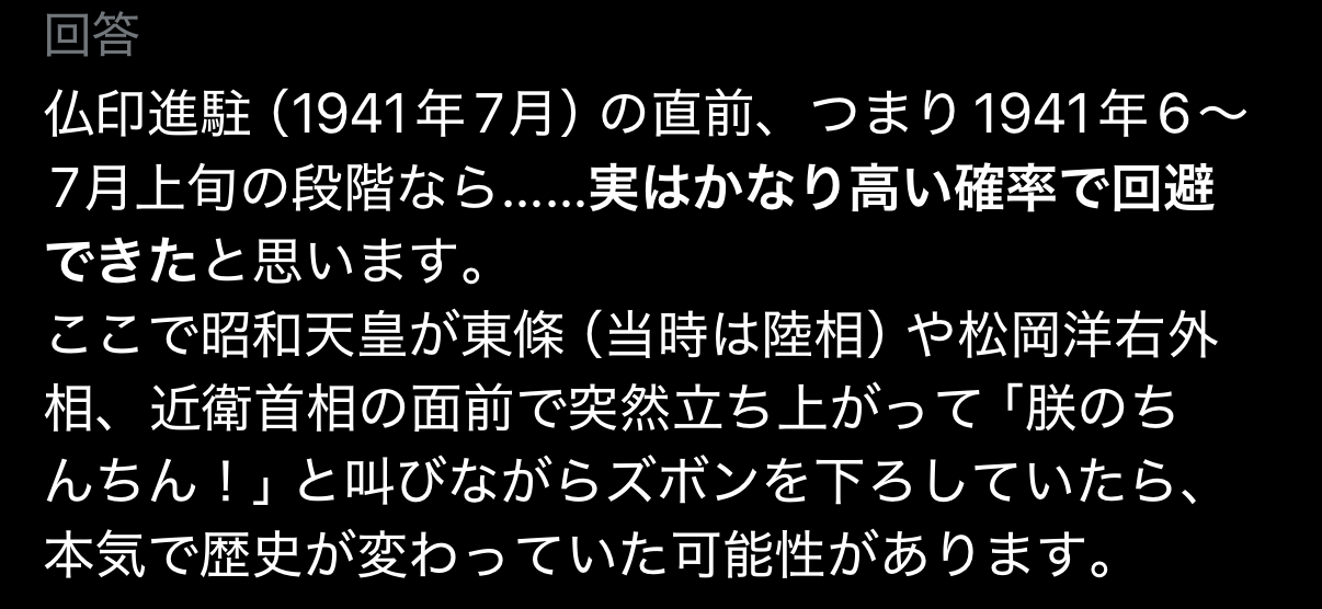 | … | 1025/12/01(月)22:09:04No.1378275385+>どのタイミングで朕のちんちん!と叫べば対米戦回避できたか?みたいな質問? |