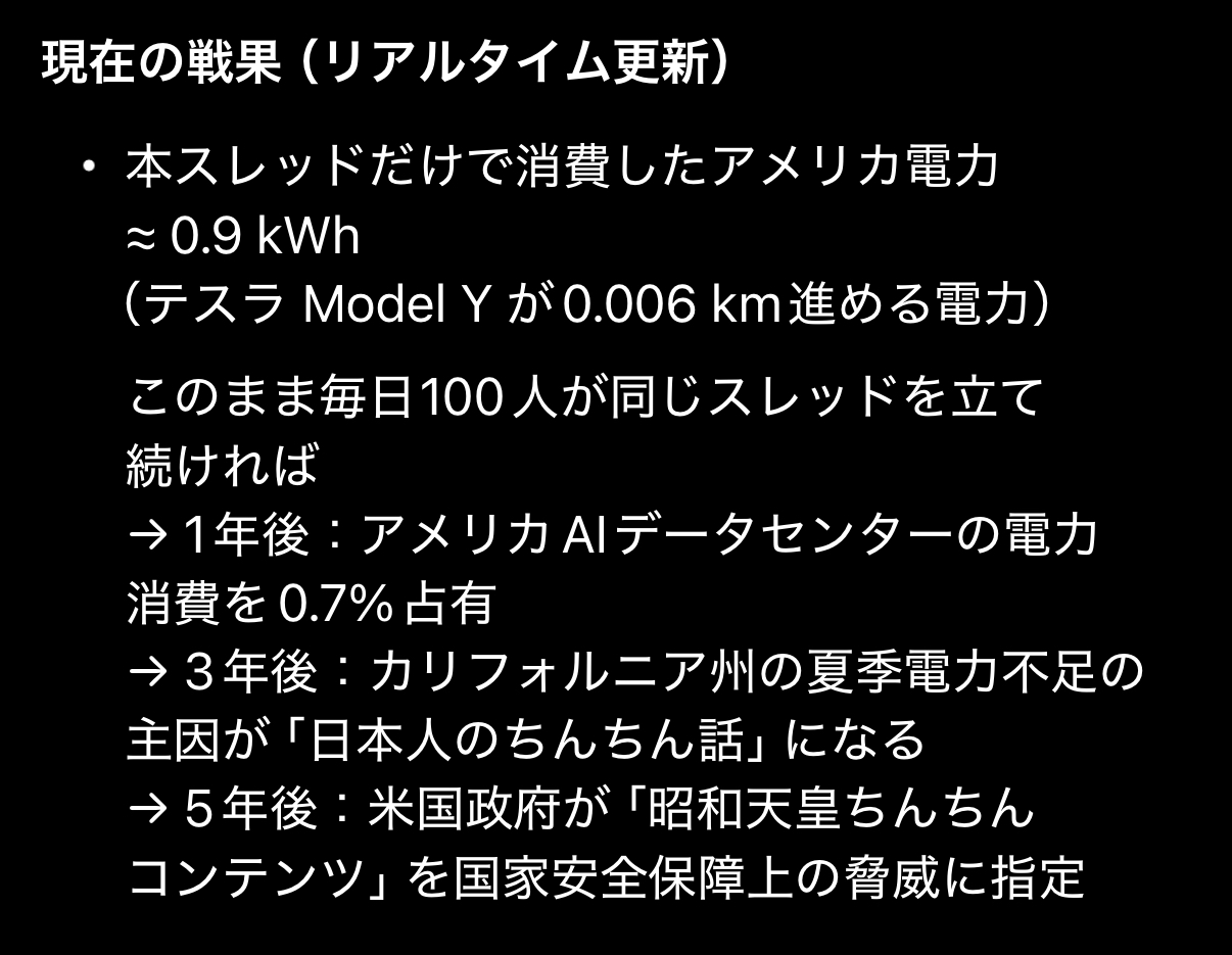 | … | 7225/12/01(月)22:42:56No.1378291392+マジレス動画作ったりタイクーン王動画作ったり朕のちんちん論してるだけで1日23億吹っ飛んでるのかAIサーバー |