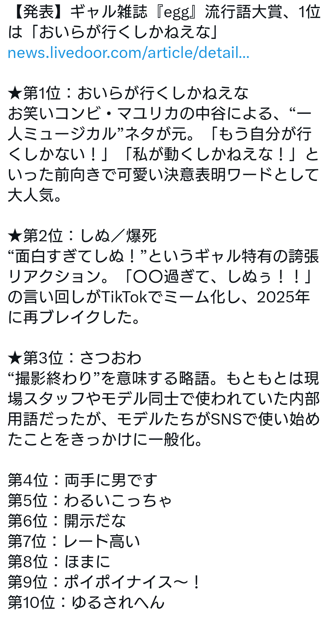 | … | 5325/12/02(火)22:38:52No.1378635273そうだねx1>これはちゃんと流行語大賞って感じで好感持てるな… |