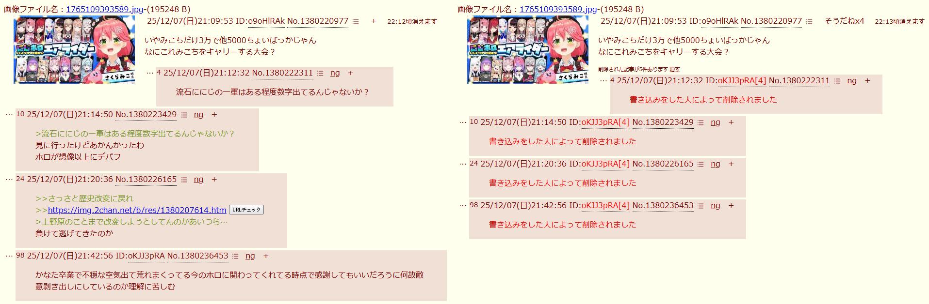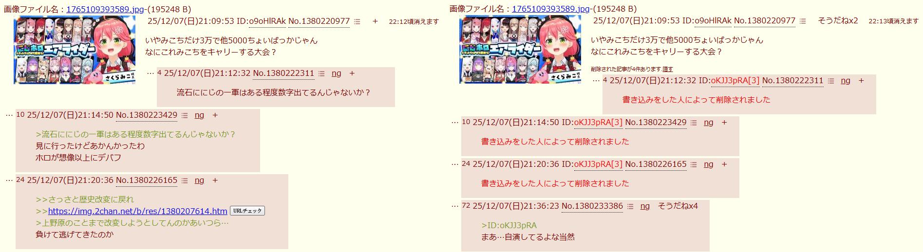 | … | 725/12/07(日)21:13:49 ID:FmIGI79.No.1380222957そうだねx7にじ側”質”無くね? |