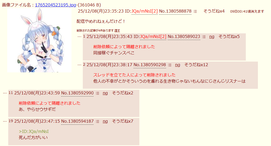 | … | 2825/12/08(月)23:51:21 ID:TAgdCuYYNo.1380595973そうだねx19>案の定「」がホロ粘着スレ立ていてよかった |
