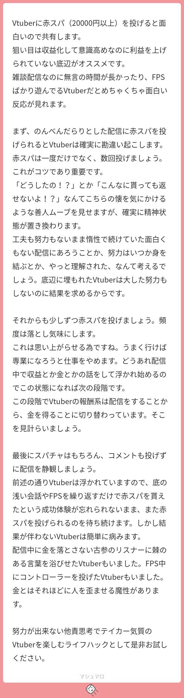| … | 27025/12/14(日)18:23:17No.1382465536そうだねx2スパチャがVオリジナルの文化だと思ってるキチガイが書いた文章 |
