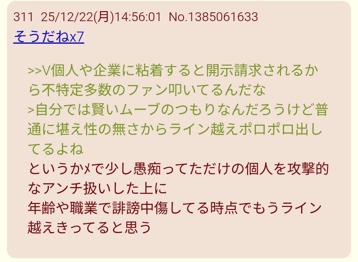| … | 1925/12/22(月)16:44:15No.1385084844+>「」相手にお前らこそVチューバー荒らしだ!荒らし荒らし!荒らしてない証拠見せろ!って言ってるいつもの荒らしに紛れてVチューバーへのガチの誹謗中傷してるやつが一番訴訟リスク高そう |