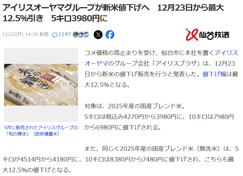 | … | 5325/12/23(火)01:06:38No.1385261330そうだねx2アイリスオーヤマって割と前からお米屋さんだよね |