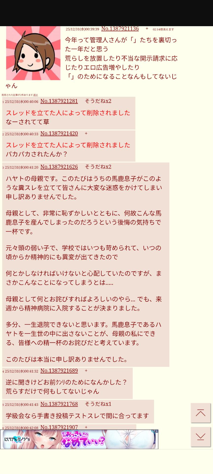 | … | 1025/12/31(水)01:25:29No.1387933784そうだねx3さっきもすぐスレ消して敗走してたよね |