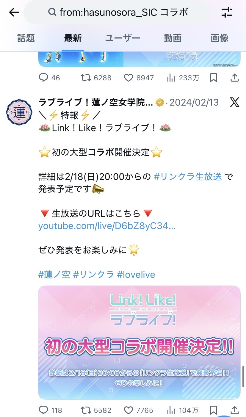 | … | 30526/01/03(土)19:09:02No.1389162218そうだねx1デカい発表はリンクラ生放送でからと思ったからビックリなんですよ…! |