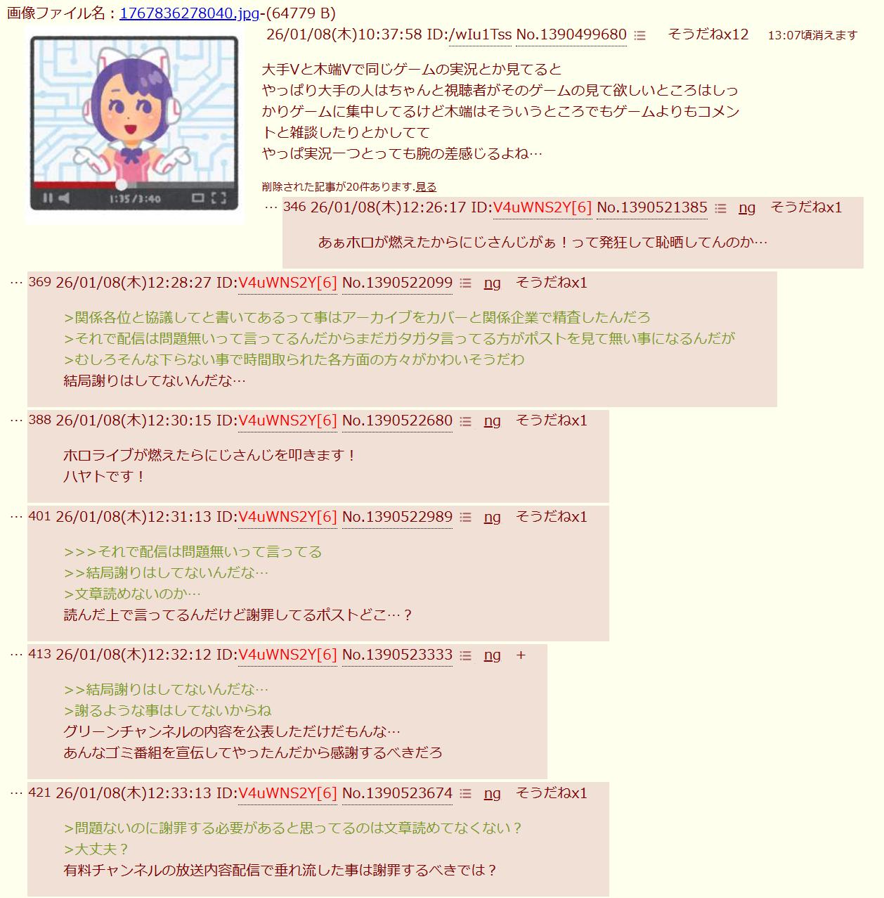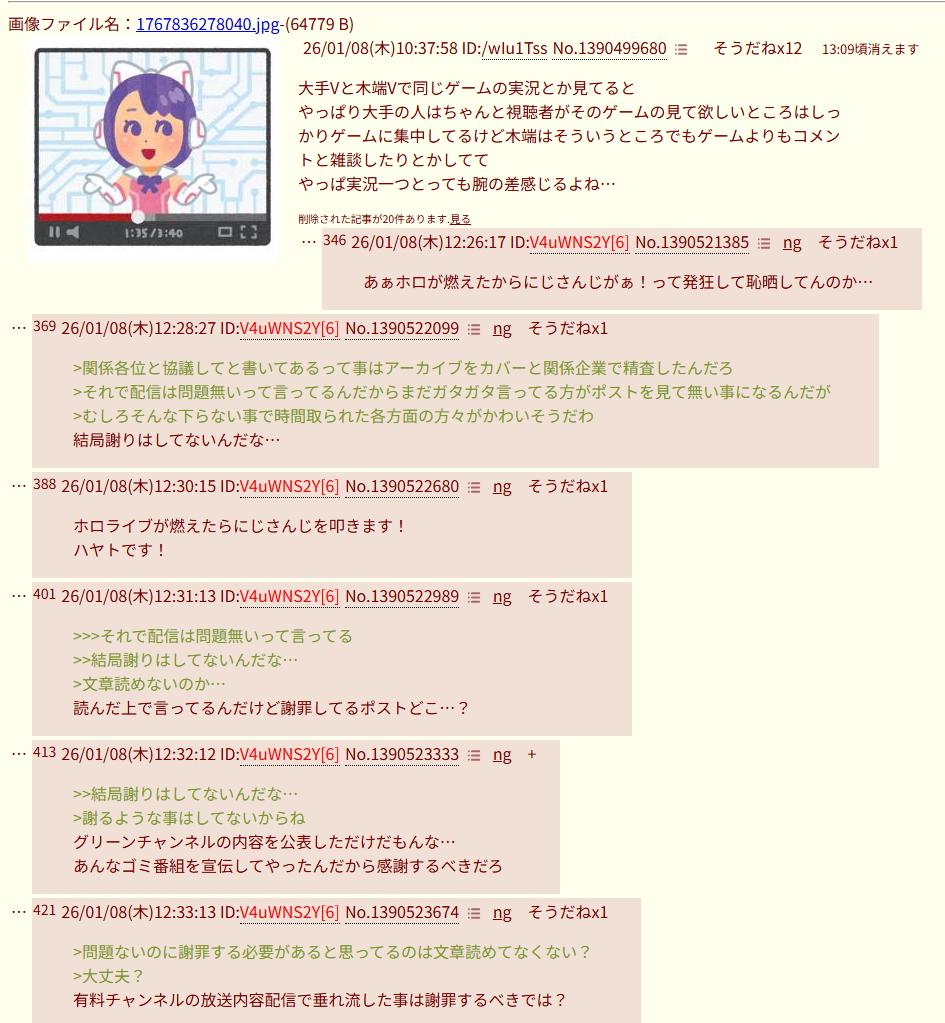 | … | 2626/01/08(木)11:09:47No.1390504851+>大手っていうかニコニコ出身は台本作ってそうな人が多い |
