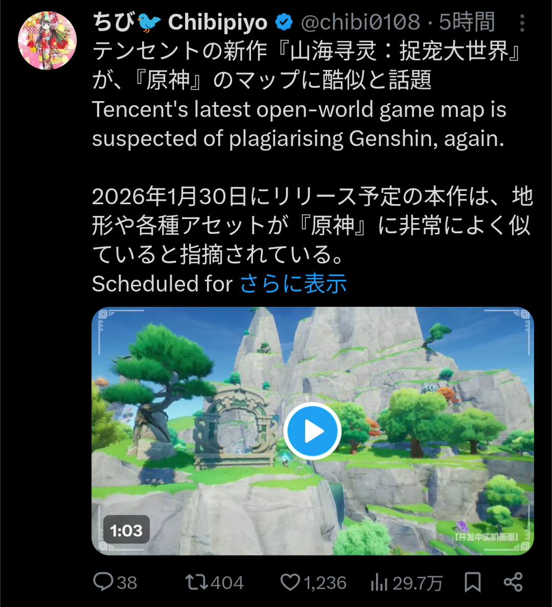 | … | 9126/01/09(金)17:21:32No.1390868157そうだねx3そもそも原神リリース時のパクリだ何だってシェーダーが似てたからとかいう地獄みたいな理由だったぞ |